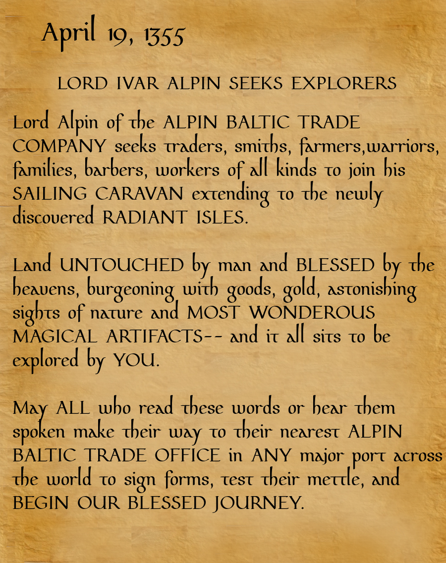 You are an explorer. Word of the Alpin Baltic Trade Company’s expedition has traveled far and wide. You have come by boat to a new world through a very rigorous voyage many have not survived. You have heard the rumors, of riches and mysteries, in a deeply unfamiliar territory that begs for your homestead. Either by choice or force - or some other desires - you sailed towards the Radiant Isles..